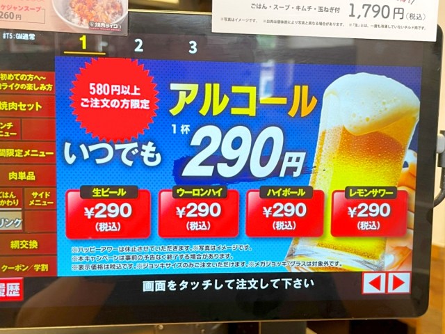 そう、実は「焼肉ライク」は店舗によってハッピーアワーを実施しているのだ。店内タッチパネルによれば、キャンペーン中はハッピーアワーは休止となっているようだが……。