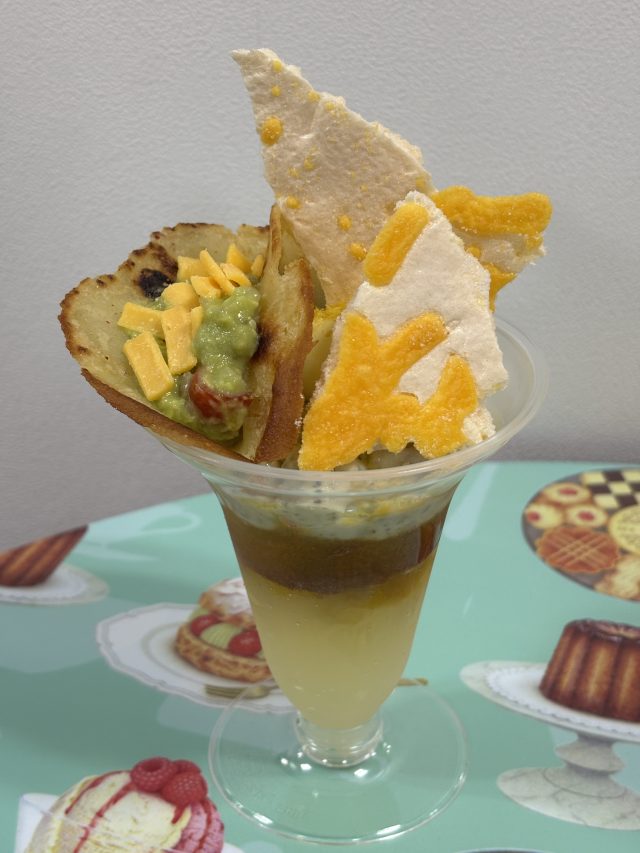 パッと見は、華やかな装飾のパフェ。だがしかし、よ〜くみると、様子がおかしいのである。パフェの上に食事とお菓子が混在している。