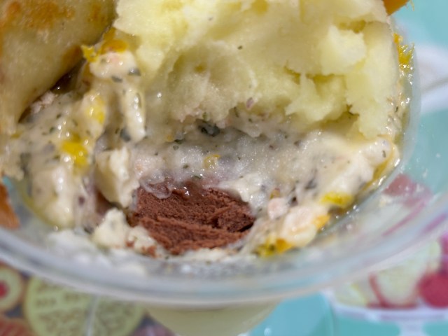 問題はこちらである。甘いのかしょっぱいのかすらよくわからない。ただ、見た目はめちゃくちゃオシャレそうである。先日、江川記者が東武チョコミントフェアのチョコミントコロッケの記事を出していたが、おかずかスイーツかよくわからない食べ物が今流行ってるのかもしれない。