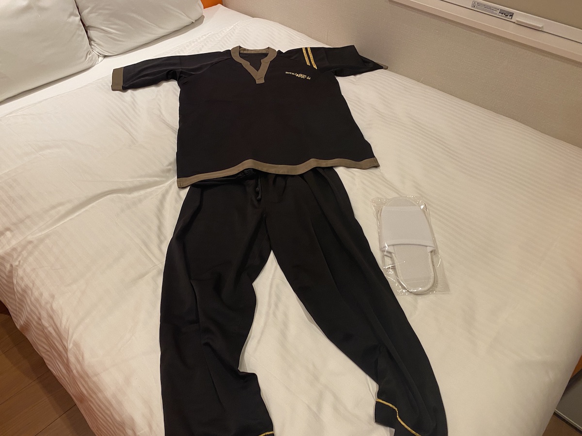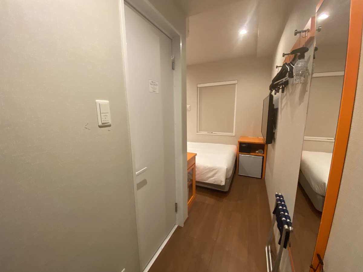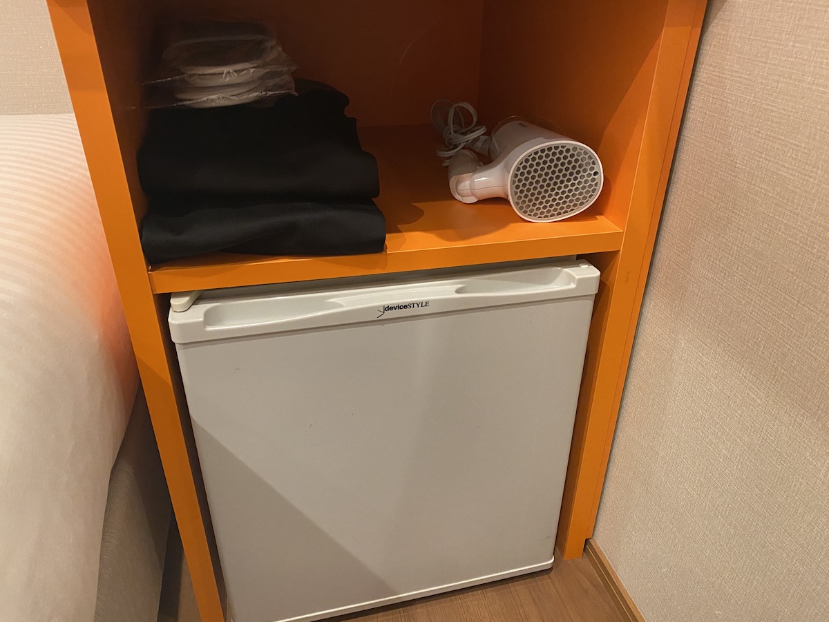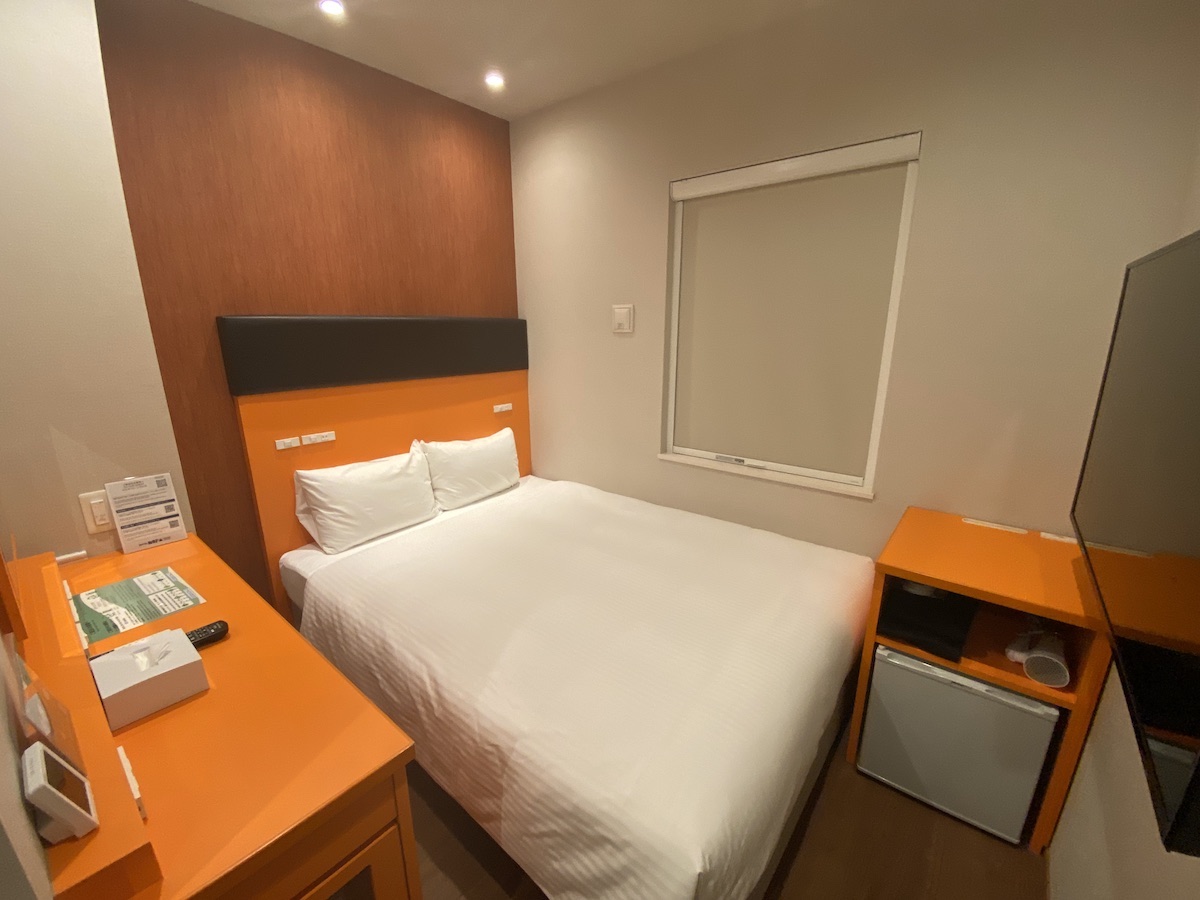 スタンダードダブルルームでベッド幅は広々140cm。冷蔵庫に部屋着、ドライヤーなどなどビジホに必要なものは一通り揃っているし、これと言って不満はない仕様である。