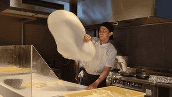 彼は現地のロティチャナイ職人だそうで、普段は黙々と、お客さんがいる時は上の画像のように派手に回してパフォーマンスしながら生地を作り続けていた。