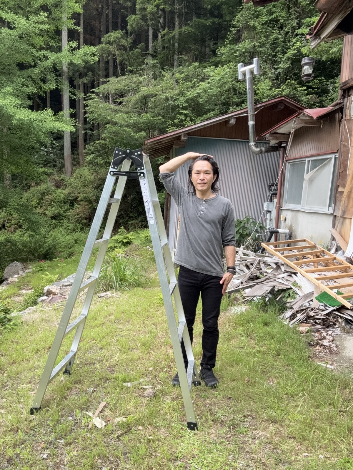 そこで用意したのが、Amazonより提供された高さ1.7mの「はしご兼用脚立」である。折り畳んだ時点で私よりデカい。