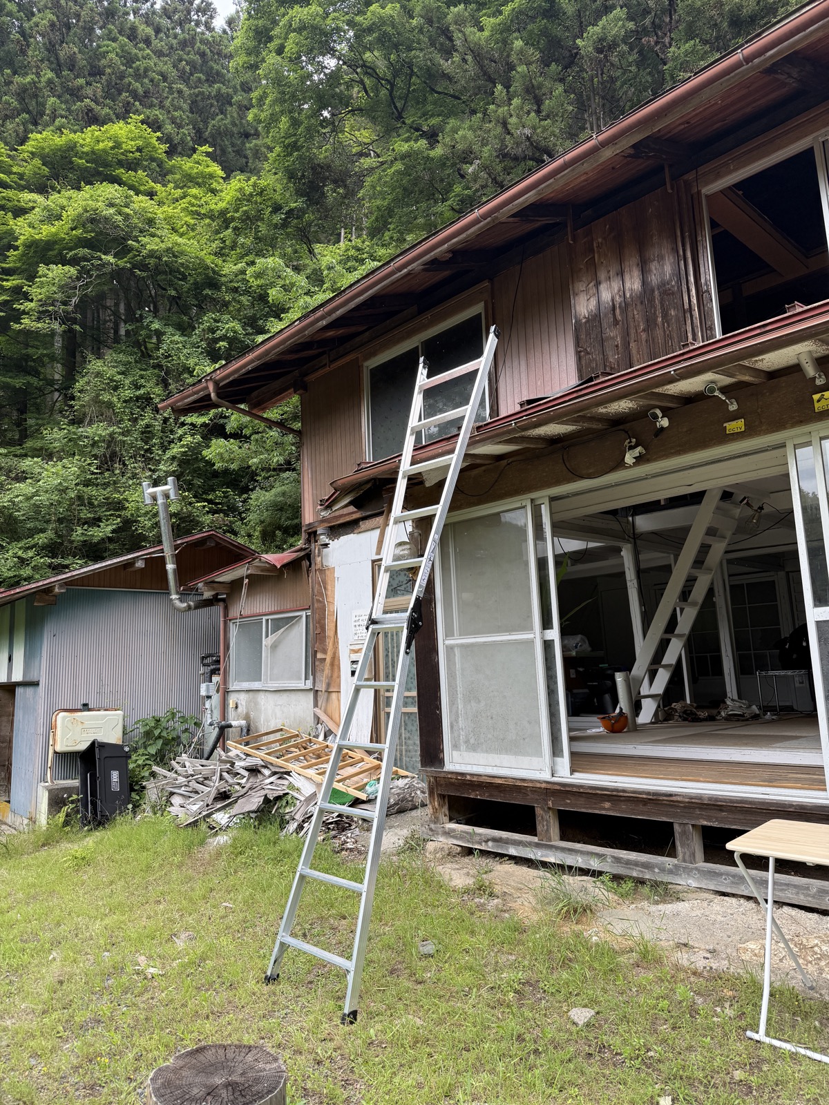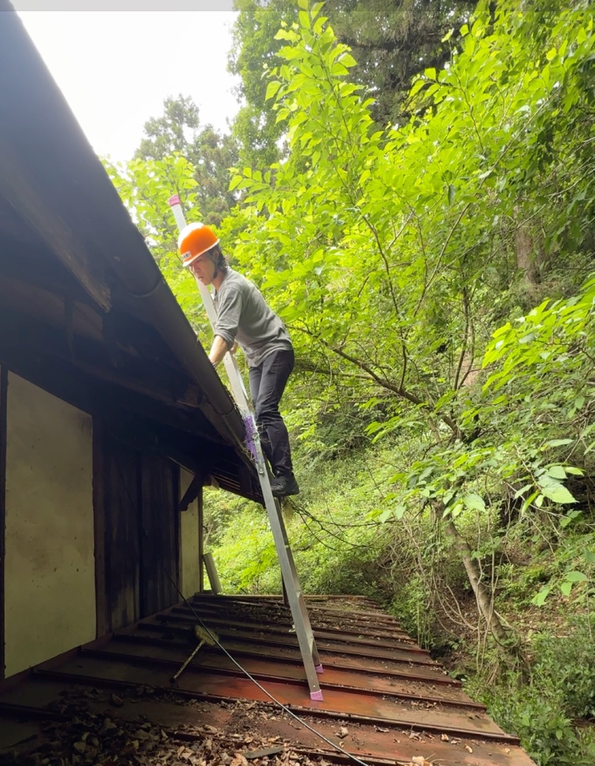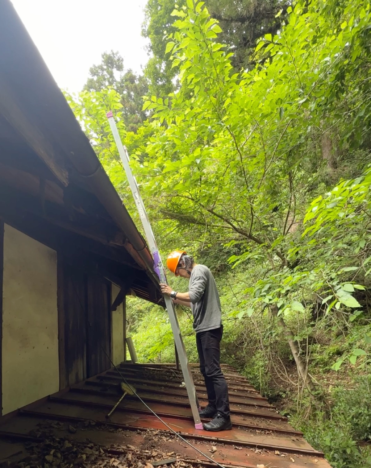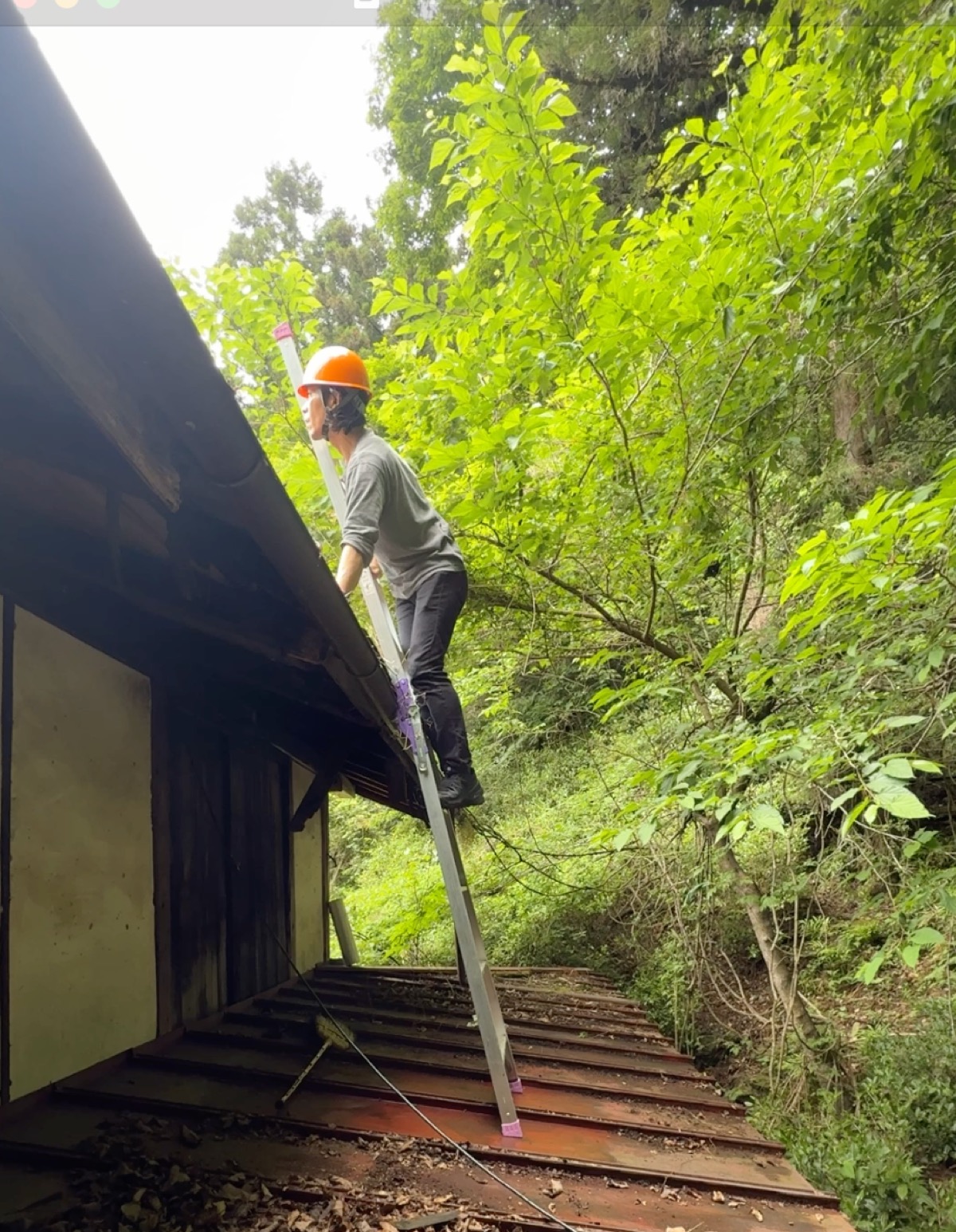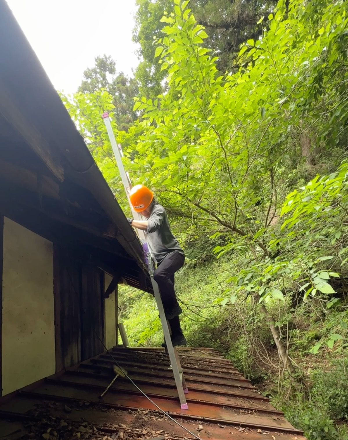 あとは脚立を立てて、屋根に登れば……