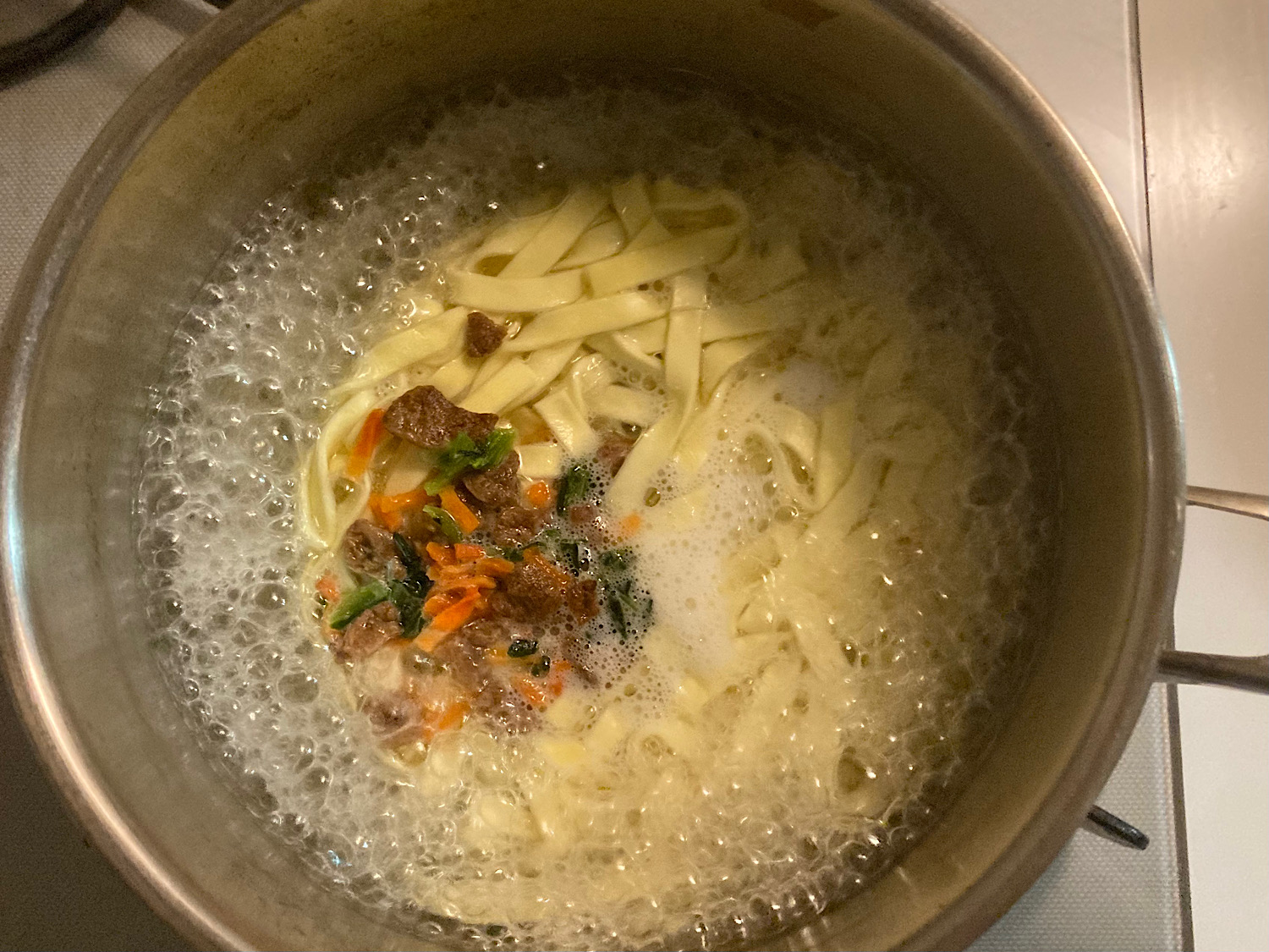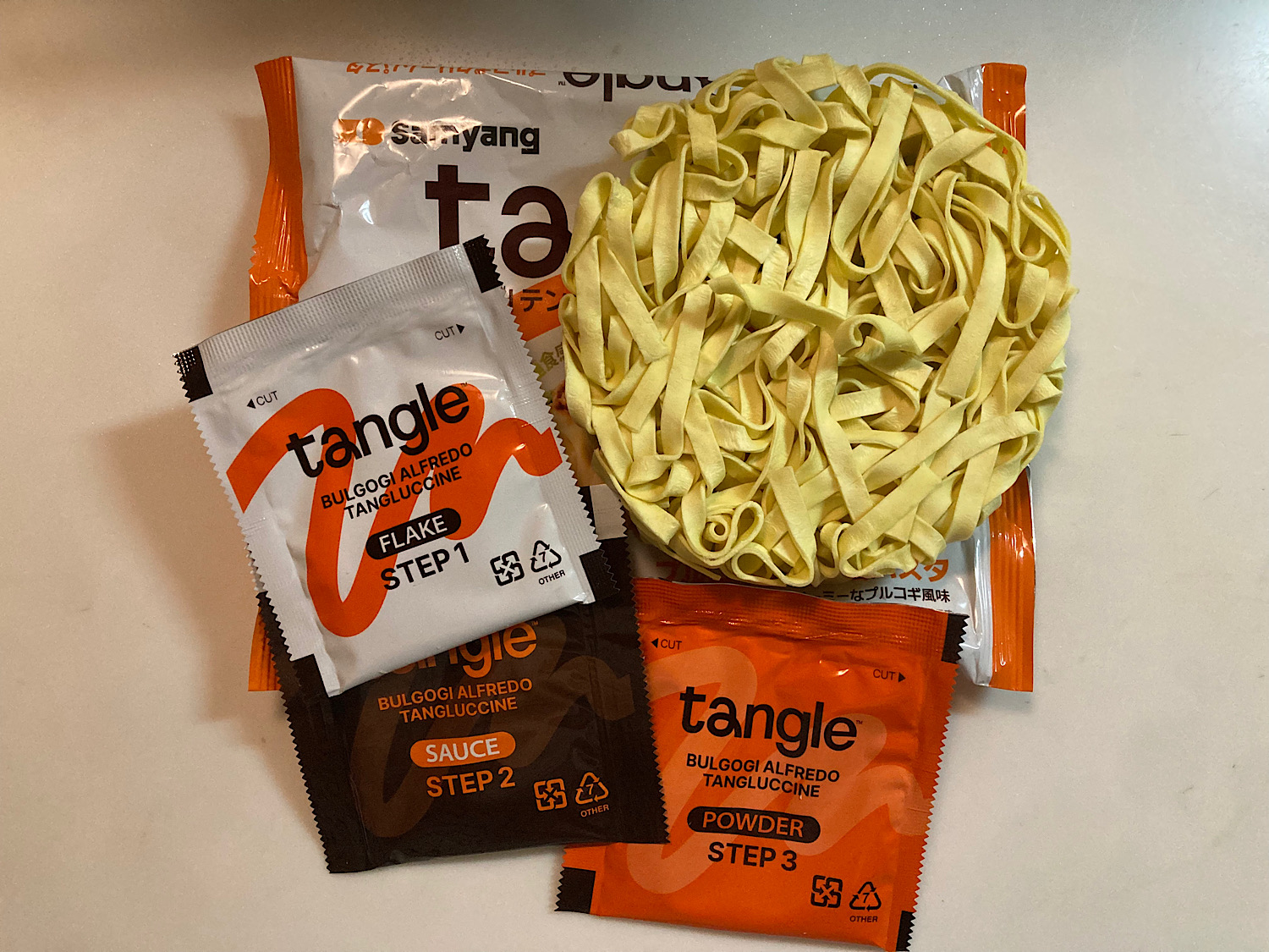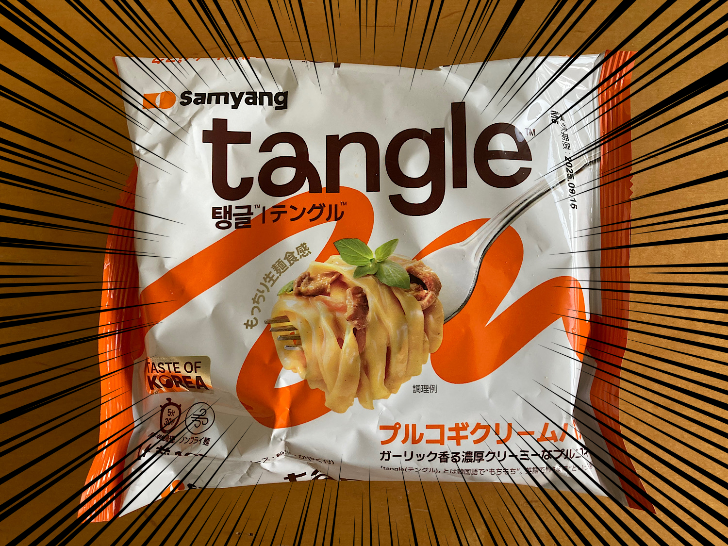 確かにインスタントらしからぬもちもち感だ。フェットチーネみたいな平麺を噛むたびに、ガーリック風味の甘辛プルコギ味とカルボナーラみたいなクリーム味が口いっぱいに広がる。