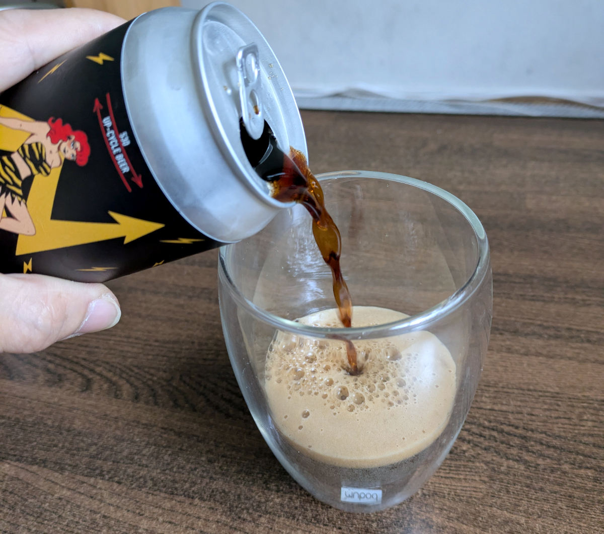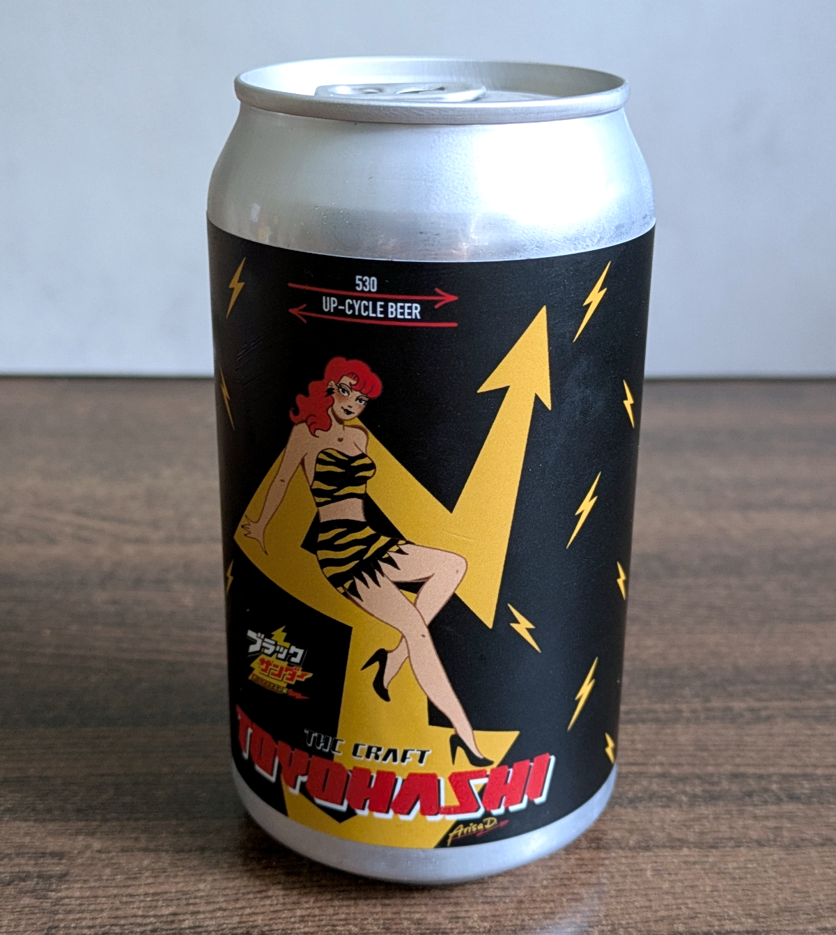 1本購入して持ち帰った。缶のデザインは黒と黄色をベースにしたブラックサンダーカラー。よく見ると、缶に描かれた女性は、語尾に「だっちゃ」がついてカミナリを操る漫画・アニメキャラみたいだな。