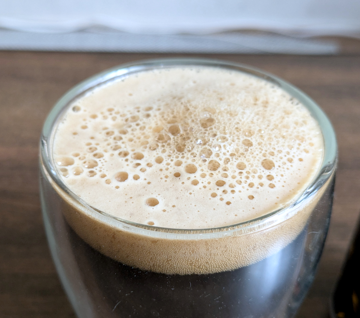 クリーミーな泡の柔らかい口当たり。それでいて苦味は強く、どっしりと重量感のある飲み心地だ。だが、ただ苦いだけではなくて、濃いめのコーヒーを思わせるボディの強さ、そしてコクがある。たしかにチョコレート菓子を想起させる甘さはほとんどない。余韻にチョコレートのフレーバーが鼻をくすぐる程度だ。