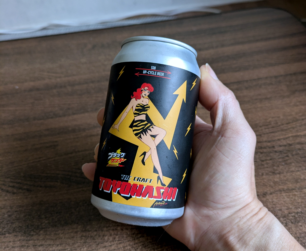 1本購入して持ち帰った。缶のデザインは黒と黄色をベースにしたブラックサンダーカラー。よく見ると、缶に描かれた女性は、語尾に「だっちゃ」がついてカミナリを操る漫画・アニメキャラみたいだな。