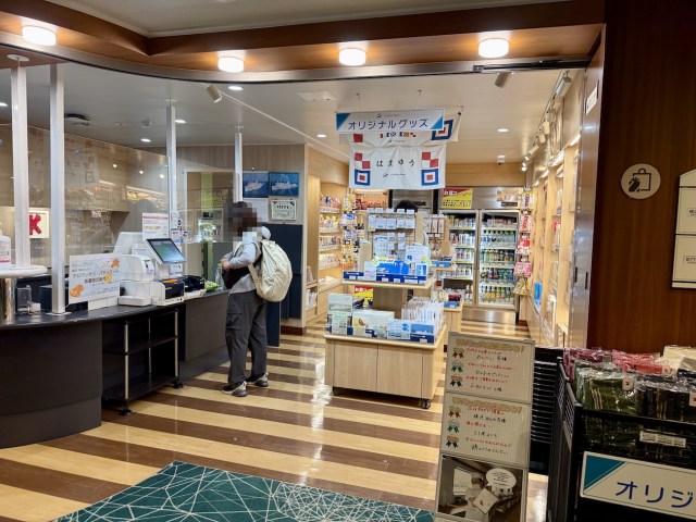 船内施設を順番に紹介する。売店ではオリジナルグッズはもちろんタオル類やスリッパ、酔い止め薬などが売っている。また横須賀・北九州土産もズラリと揃っていた。