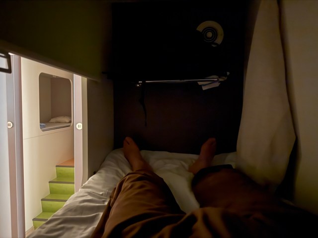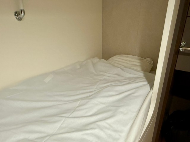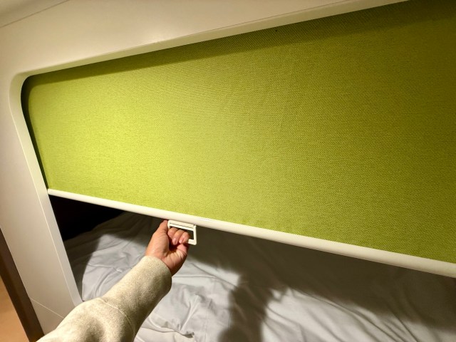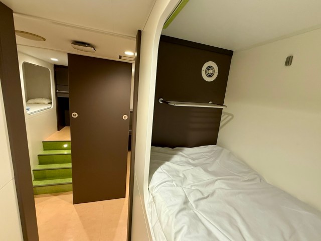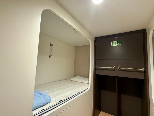 ロールカーテンでプライベートもしっかり確保できるのが特徴。ベッドごとにボックス・コンセントが設置されていて、カプセルホテル感覚でいつでも使える。そんでもって驚いたのがほとんど揺れないこと。