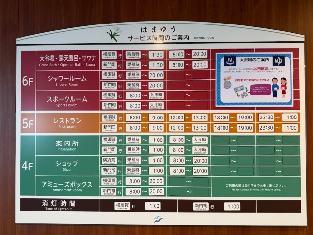 さて、先に確認しておきたいのがレストランや大浴場の営業時間。腹は減っていないので、客室に荷物を置いたら早めに大浴場(深夜1時30分まで)に行くのが良いかも……とプランを立てた。