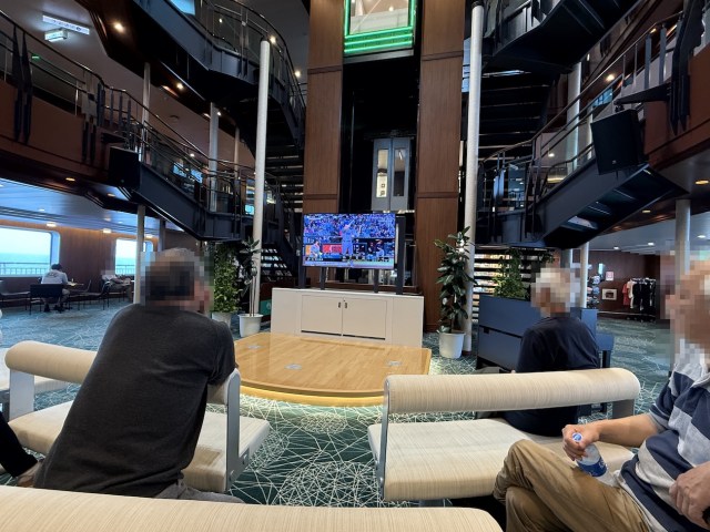 例の吹き抜けエントランスホールでは、大画面ディスプレイによるテレビ放映が(深夜1時から朝8時までをのぞいて)音声付きで行われている。表示されているのはNHK BSで、おっちゃんたちと2試合の野球中継を存分に楽しんだぞ。