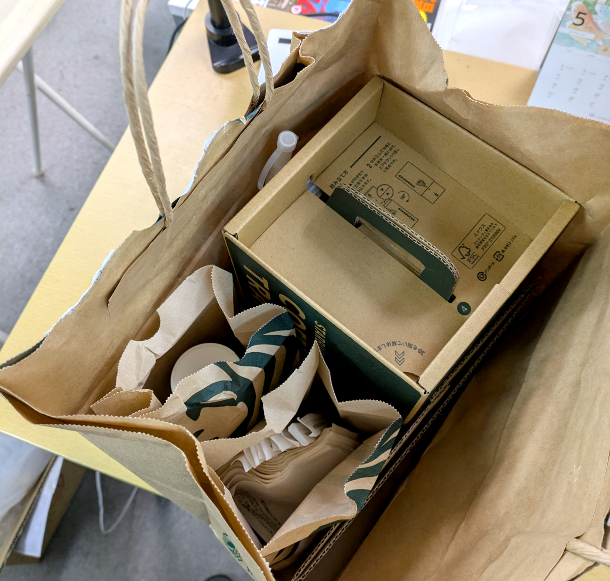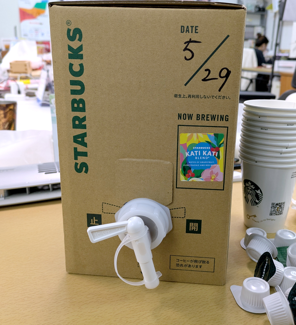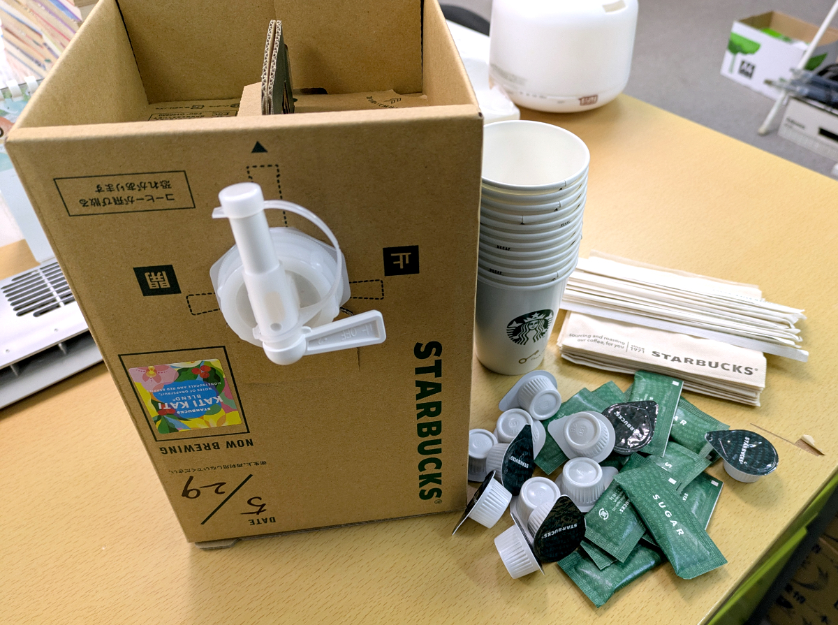 スタバのコーヒーきた~~! ダンボール入りと侮るなかれ、めちゃくちゃアツアツです。ヤケドするんじゃないか? と思うほどアツい湯気が出ているので、こぼさないように気をつけよう。