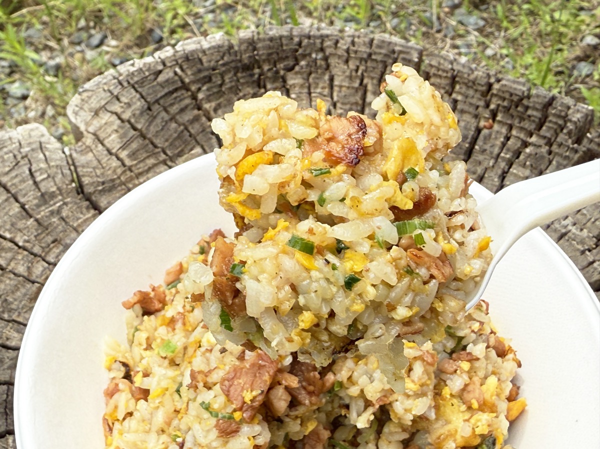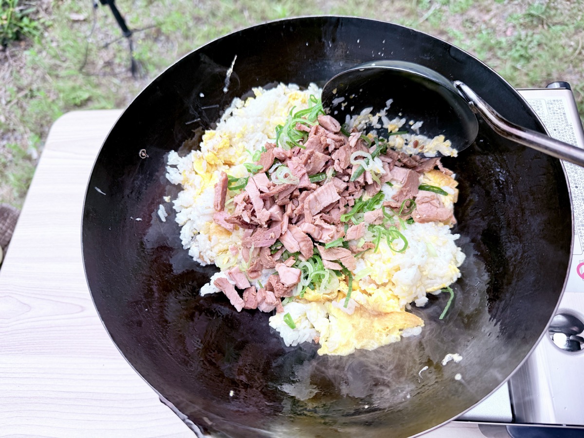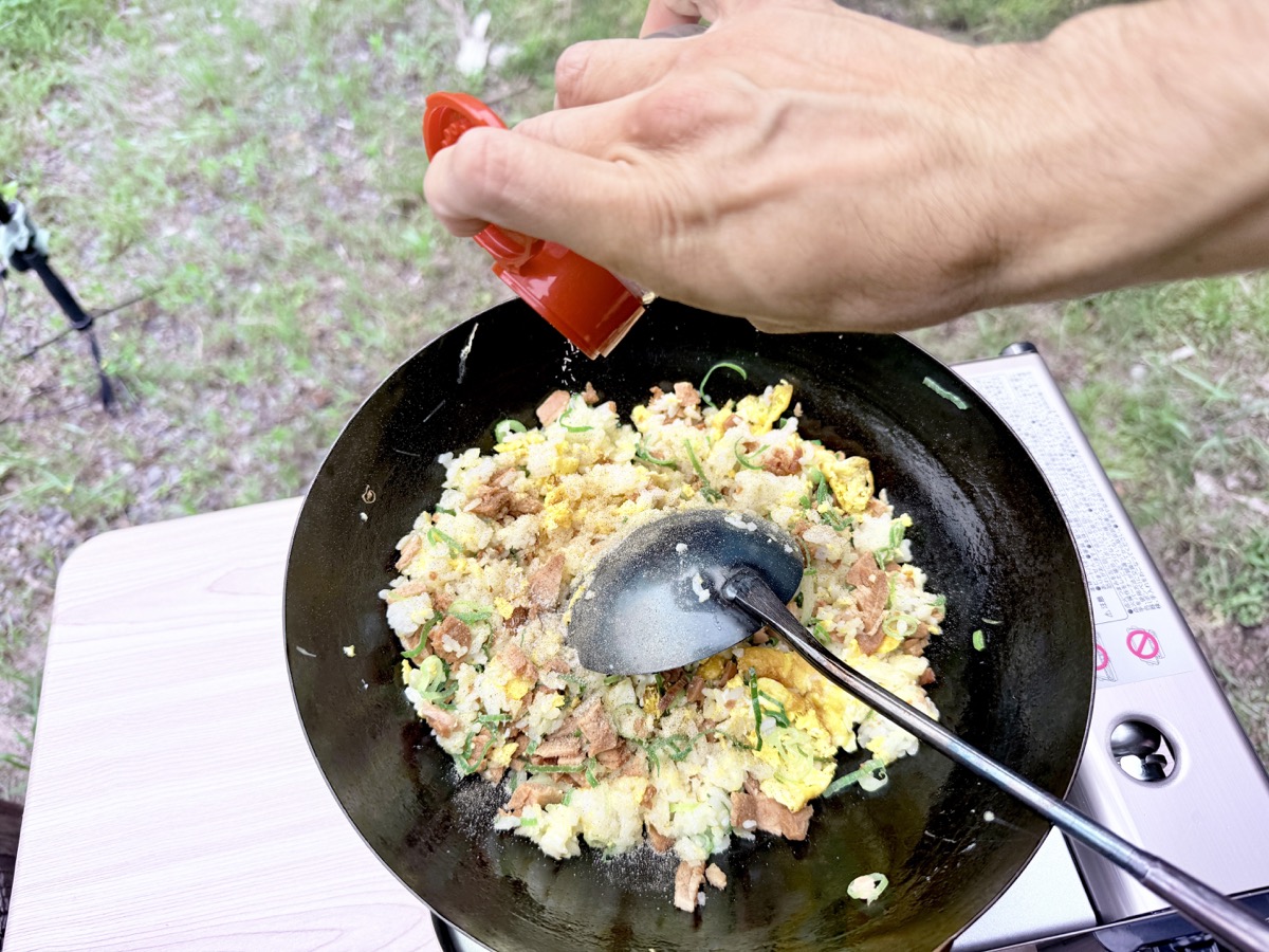 その4:そして出ました「サトウのごはん」。メーカーである「サトウ食品」の公式ページに「チャーハン」レシピが載っているほど、サトウのごはんはチャーハンに適しているらしい。なお、レンジしないでそのまま使うのがサトウ流。むしろアウトドアでは好都合だ。