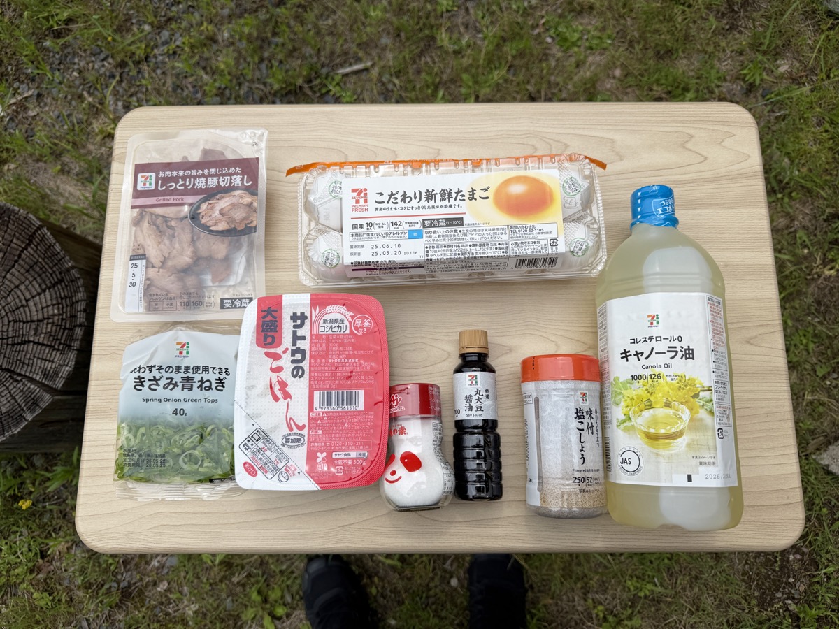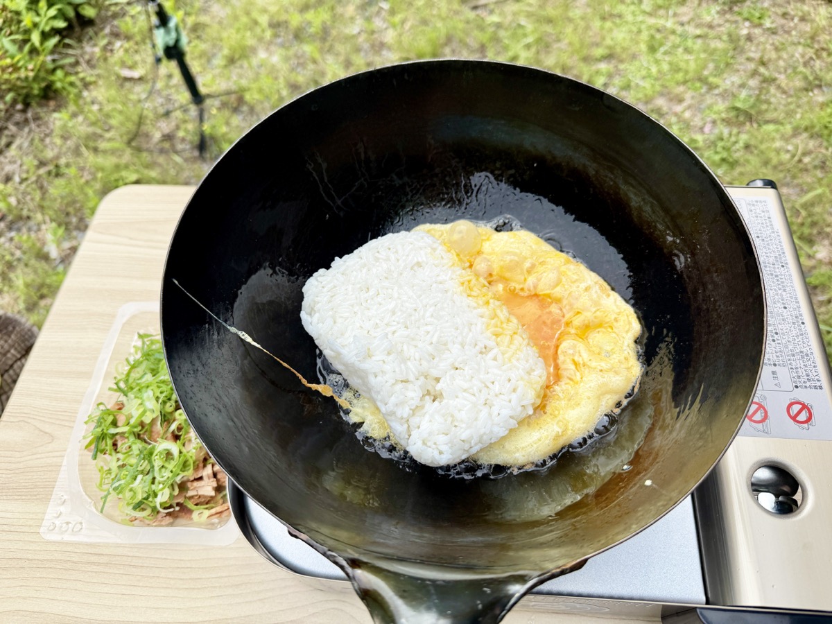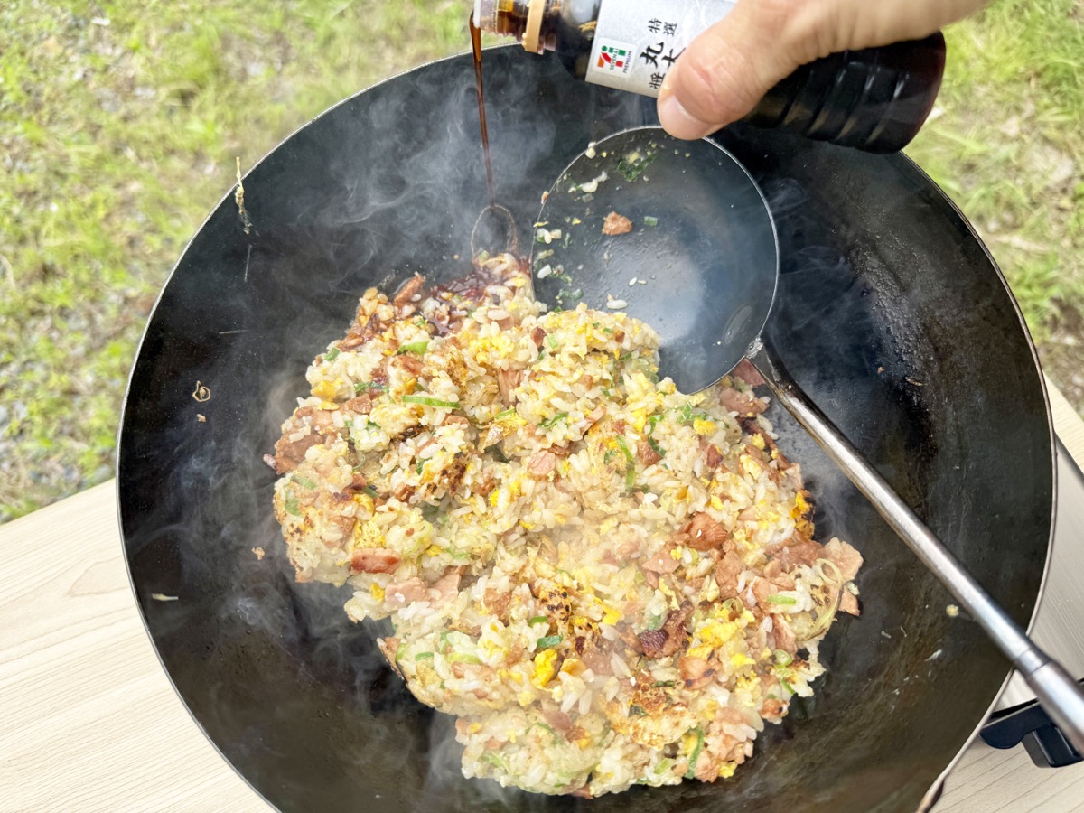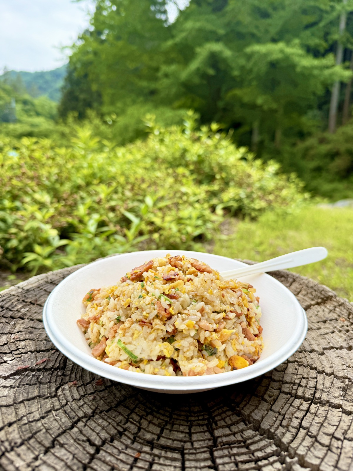 その4:そして出ました「サトウのごはん」。メーカーである「サトウ食品」の公式ページに「チャーハン」レシピが載っているほど、サトウのごはんはチャーハンに適しているらしい。なお、レンジしないでそのまま使うのがサトウ流。むしろアウトドアでは好都合だ。