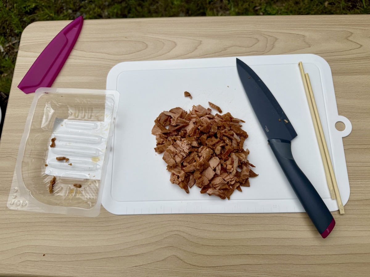 その1:チャーシューを刻む。半分ほどにしておこうかとも思ったが、メインの具がチャーシューだけなので、チャーシューメンならぬチャーシューハン的な仕上がり(特徴付け)を期待して全部入れることにした。