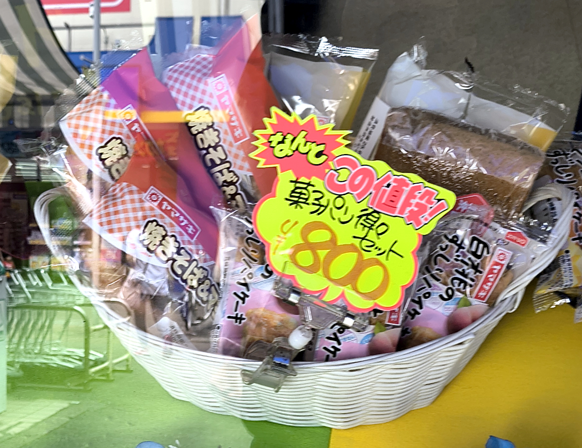 目玉はショーケースに並んでいるかご盛りセット。こちらは菓子パンとパイケーキ、8個あるのかな? が、税込800円。