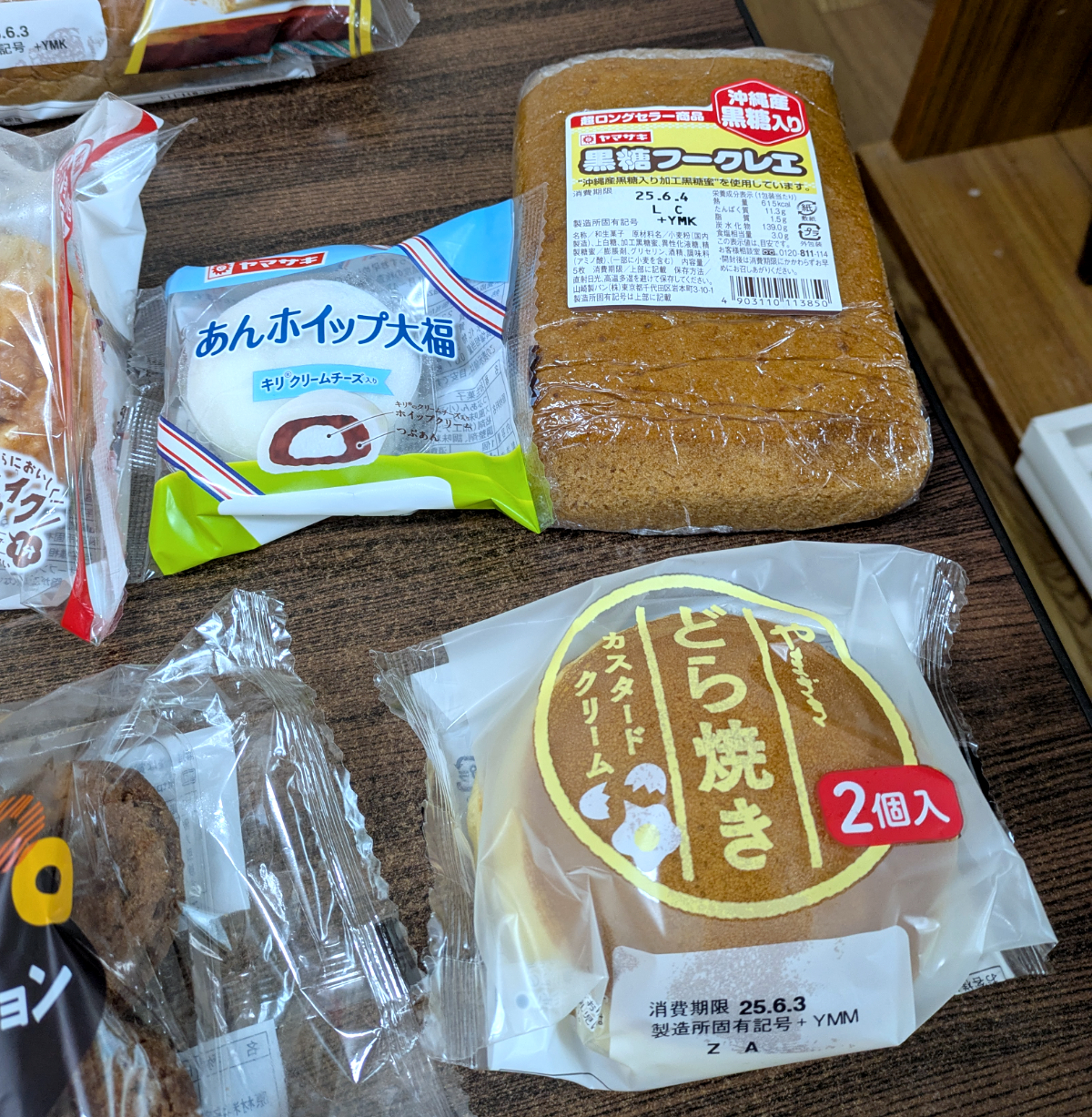 黒糖フークレエ(税込172円)・あんホイップ大福(税込149円)・どら焼きカスタードクリーム(2個入り 税込128円)の3つがオマケでついてきた!