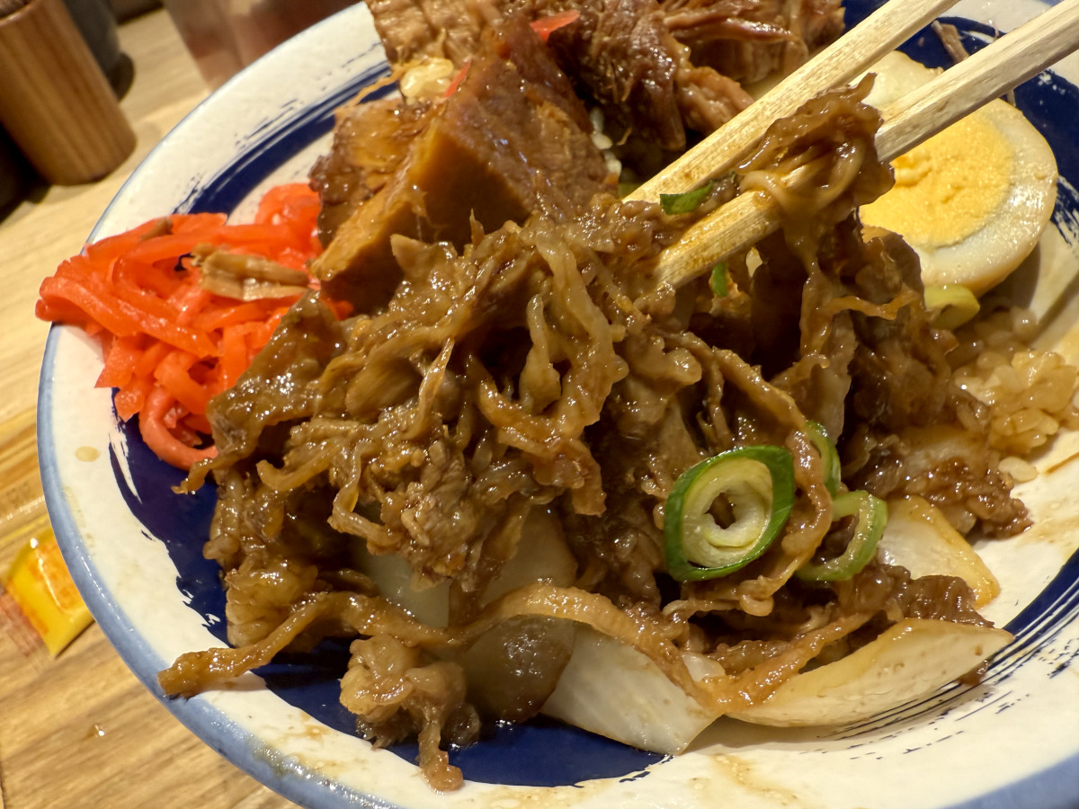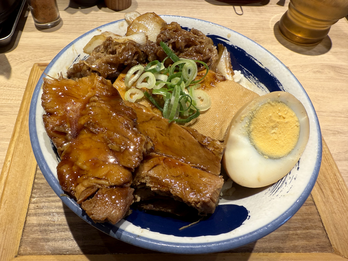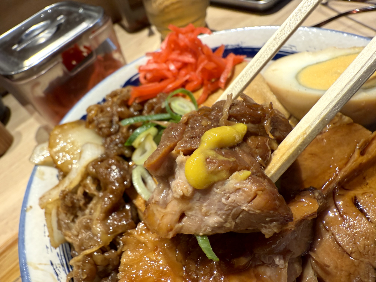 『豚角煮と牛焼肉丼』に言葉はいらず、ただ豚の角煮と牛焼肉がのってるだけのシンプルな丼。単品ずつでも丼になりそうなところを、あえてダブルで突っ込んだ肉々しさ満点のメニューである。