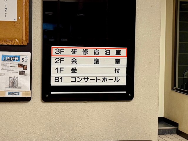 チェックイン手続きをしてルームキーを受け取った。客室は3階、案内によると「研修宿泊室」らしい。いわゆる合宿所的な部屋なのだろうか。