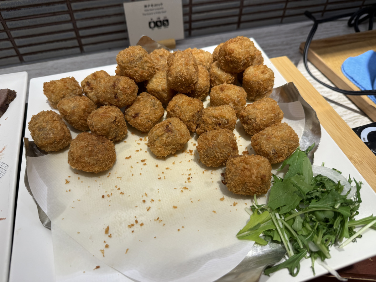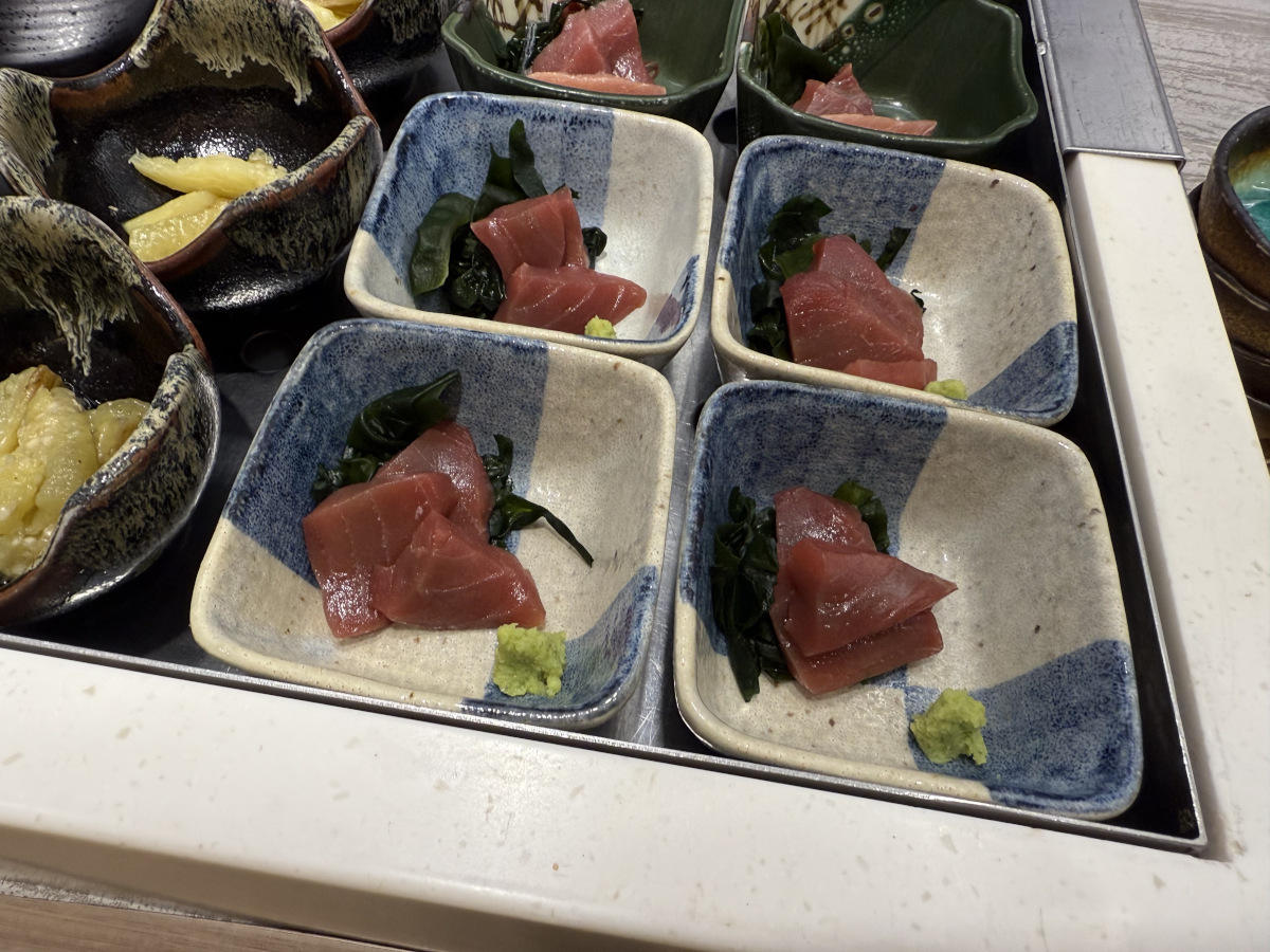 またステーキも肉々しさ満点で、次々と補充されていた。さらに小鉢ながらまぐろの刺身があるのがありがてえ! その他、明太子やちりめん山椒など、和できっちり攻められるのは強い。