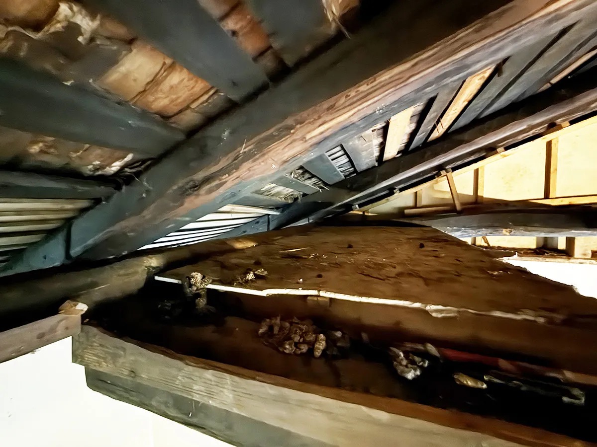 謎の動物の糞やチリ・ホコリだらけの天井部分をホウキで掃いてから、持参した100均のブルーシートで覆って洋服が汚れないようにしつつ……