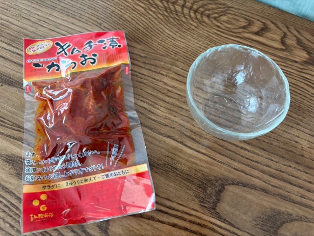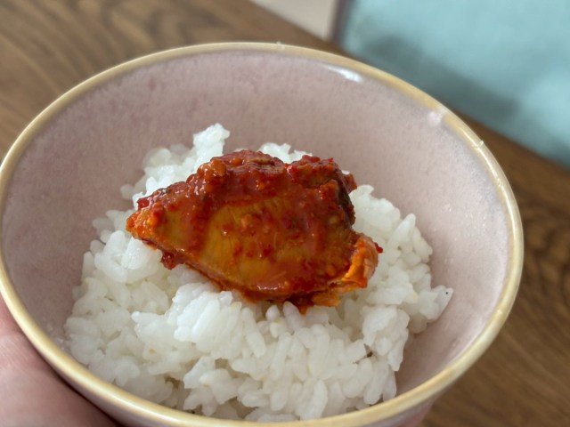 開封前にほぐしてという表示を完全に見逃し、そのままお皿へ。塊のまま、いただいてみたが、おいしい! にんにくが結構きいていて、かつおの旨味やキムチの辛味といいバランス。