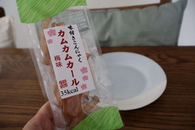 ペラペラになったこんにゃくにさまざまな味付けがされている。今回は梅味を購入したが、こんにゃくとは思えないほど、しっかりした食べごたえとちょうどいい味付け。