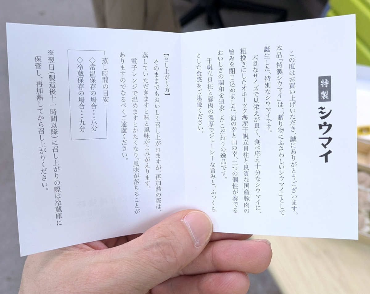 ……と、その前に一応美味しい食べ方を確認しておきますか。商品のしおりを読んでみると、原材料にはオホーツク海産の干帆立貝柱と国産の豚肉を使っているそうだ。