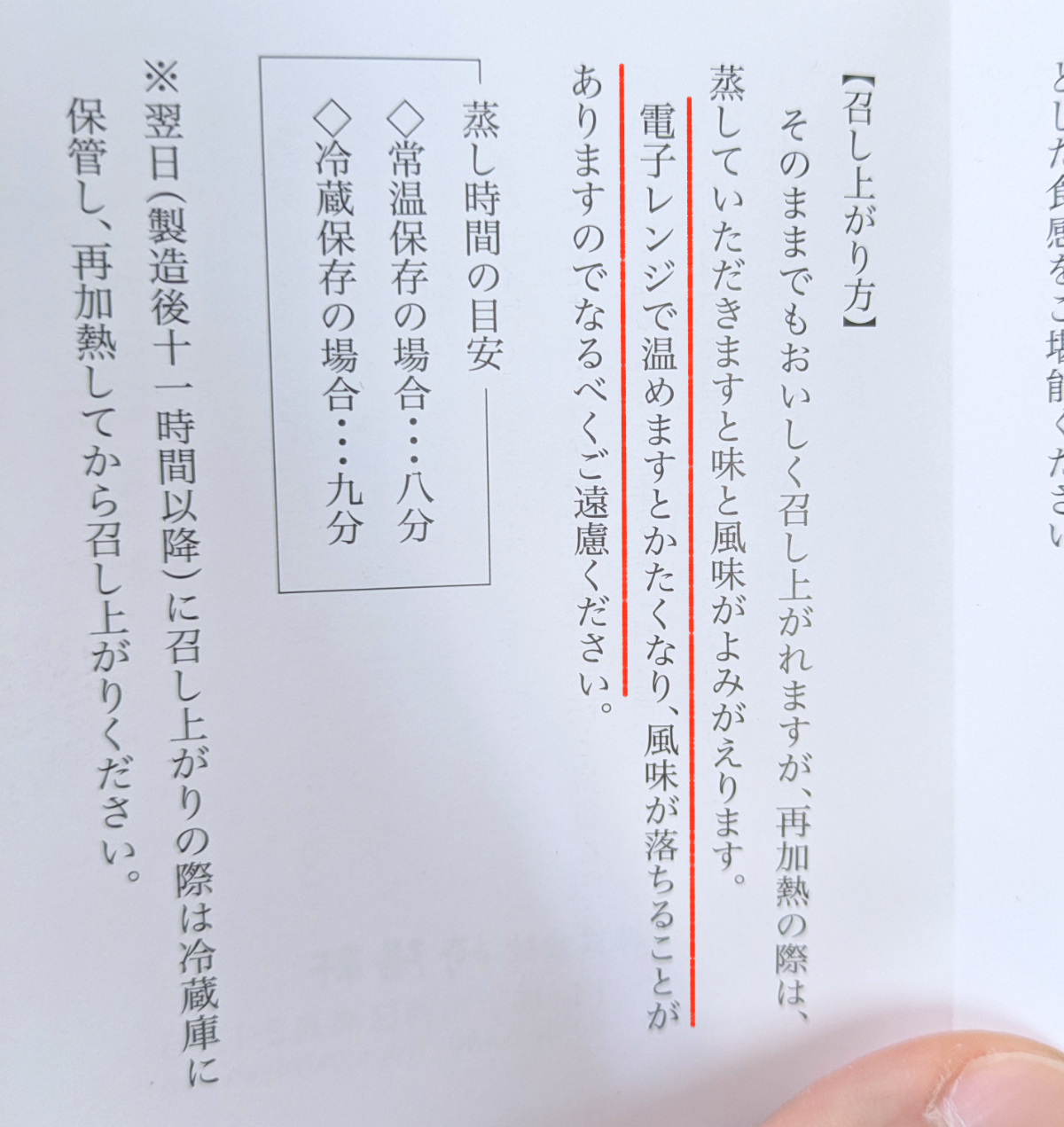 「そのままでもおいしく召し上がれますが、再加熱の際は、蒸していただきますと味と風味がよみがえります。電子レンジで温めますとかたくなり、風味が落ちることがあるのでなるべくご遠慮ください」