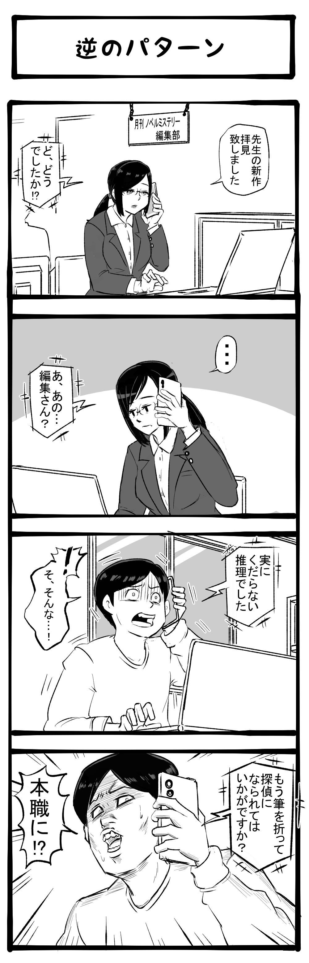 探偵の推理が否定される時のアレ! 窮地に立たされてる小説家! 四コマサボタージュBYD第121回「逆のパターン」