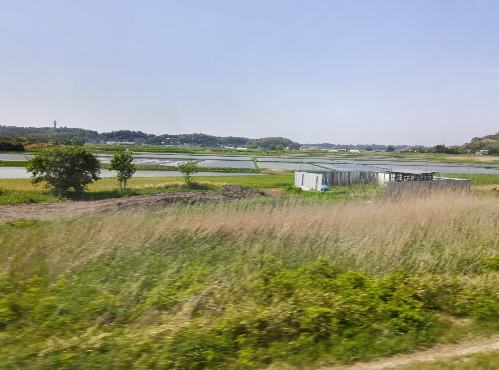 やることがない電車の席。長い距離を移動する特急とか新幹線になると窓の外の景色も楽しみの1つと言えるだろう。街は遠く、晴れた空の下広がる田園地帯の解放感。浄化される~。