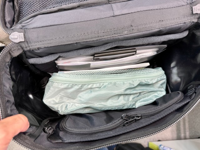 PC以外の書類(学生なら教科書)やお弁当等をメインスペースに収納する感じか。部活をしている学生ならタオルや着替えだって入るだろう。