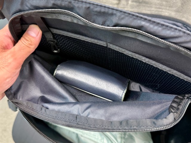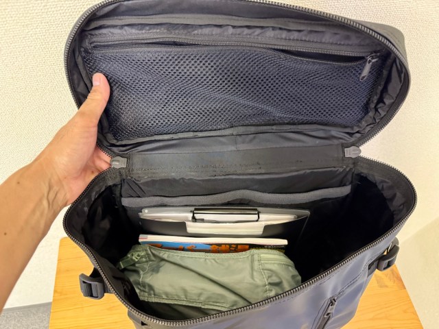 なるほど、大人のランドセルみたいな感じなのだろうか。フタの裏側にはメッシュ仕様のポケットが付いていて財布、鍵、イヤホンなどの小物類を入れておくのに便利。中身が見えるから使いやすい。