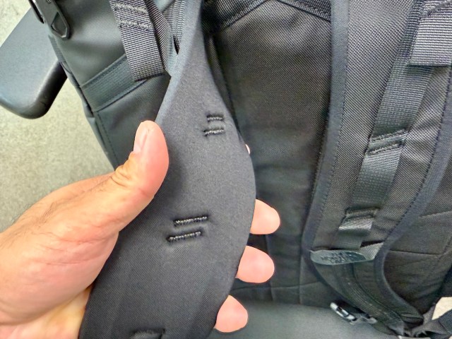 最後に背負い心地を確認してみると、ショルダーストラップの内部にクッション材が入っていて快適。とは言っても、最近のリュックはだいたい肩の負担を軽減するクッション材が入っているから普通と言えば普通か。