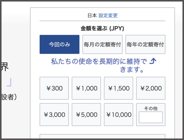 しかも、わざわざ「私たちの使命を長期的に維持で⤴︎きます」という文言を年間寄付の欄に添える工夫まで。