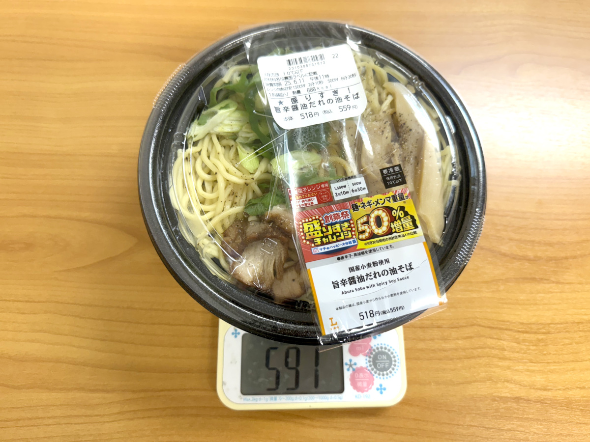 お次に「盛りすぎ! 旨辛醤油だれの油そば」は、麺・メンマ・ネギが50%増しになっており、総重量は600グラム近くもあった。価格を考慮すると1グラム1円を切る、超絶コスパ油そばと言えよう。