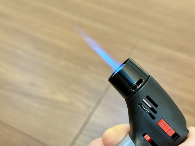 炎のサイズは調整可。安全ロックを外して、あとはライターのようにスイッチをグッと押し込むだけだ。