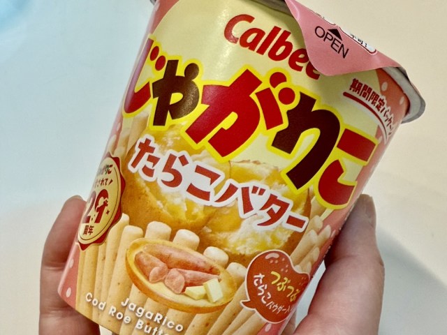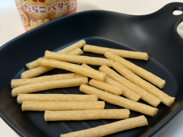 これはちょっと冒険、「じゃがりこ たらこバター」! じゃがいも → 焼くと旨い。バター → 焼くと旨い。たらこ → 焼くと旨い。なのだから、理論的には失敗するはずがないのだが……