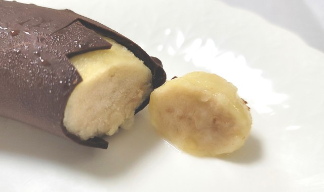 かぶりつくと、筆者は「まさかの展開」がまだ終わっていなかったことを思い知った。歯の先で軽快に砕けるチョコ、とろけるようなバナナの食感、その優しい甘みとカカオの風味のマリアージュ。清涼でいて濃密な食べ心地が、ファミマの商品のそれと極めて似ていたのである。
