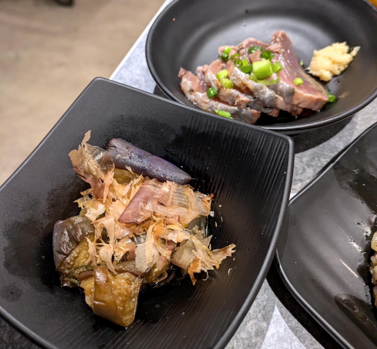 そうして順次料理が出てきて、卓上はにぎやかになりました。頼んだのは、茄子の揚げ浸し・鰹のたたき・エリンギステーキ・若鳥の唐揚げ・直火焼きチャーハンの5品