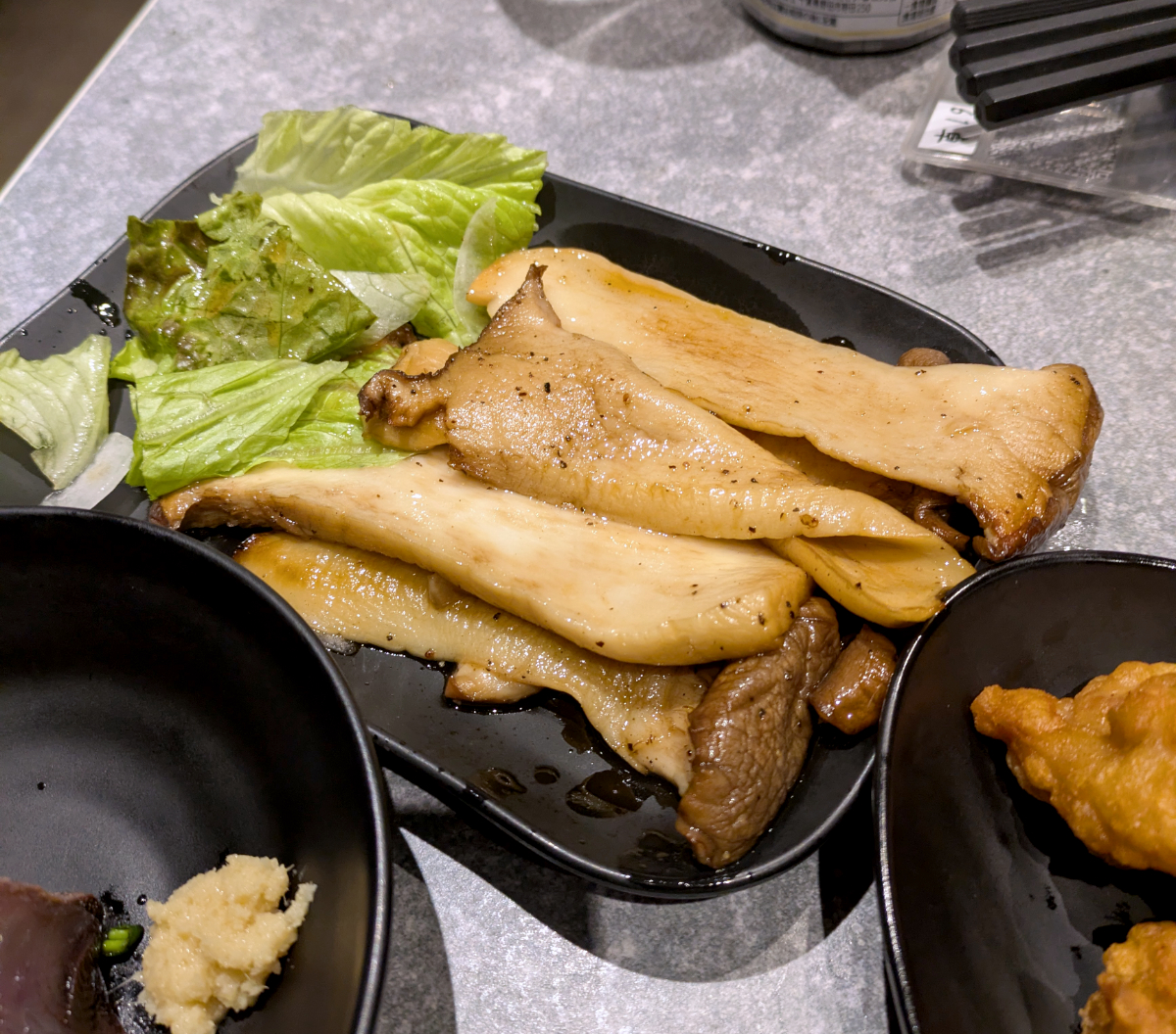 料理は思った以上にちゃんとしてる。2000円食べ放題というから全部冷食だと思っていたし、それでもしょうがないかなと考えていたけど、ちゃんと調理したものを提供している。エリンギステーキは2~3本分使っていて、結構ボリューミー。