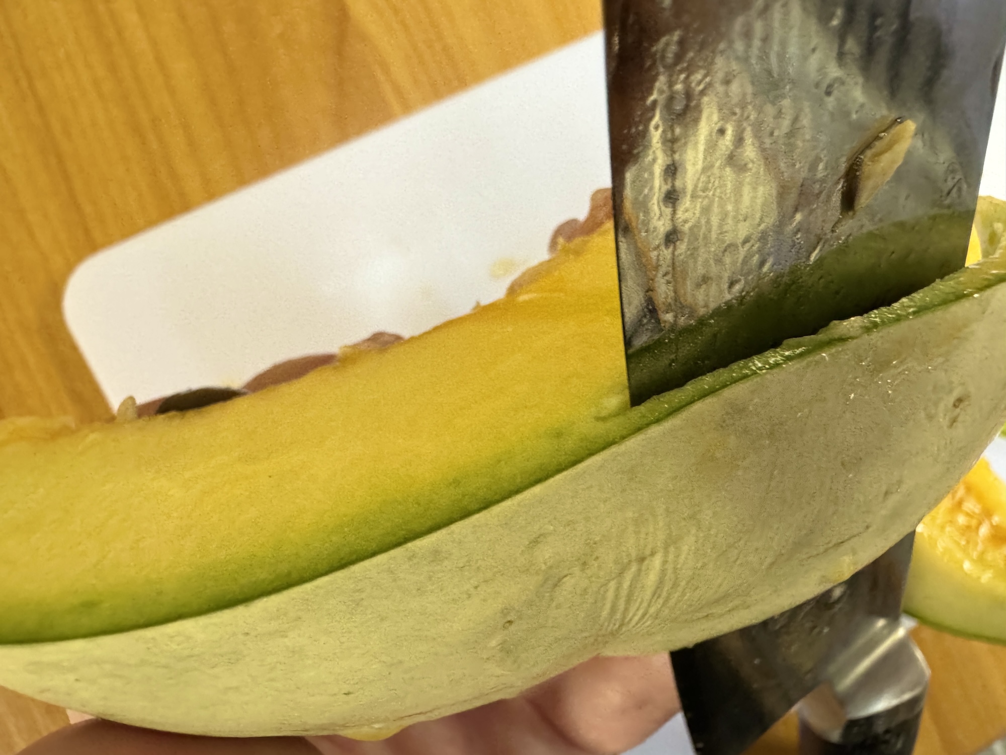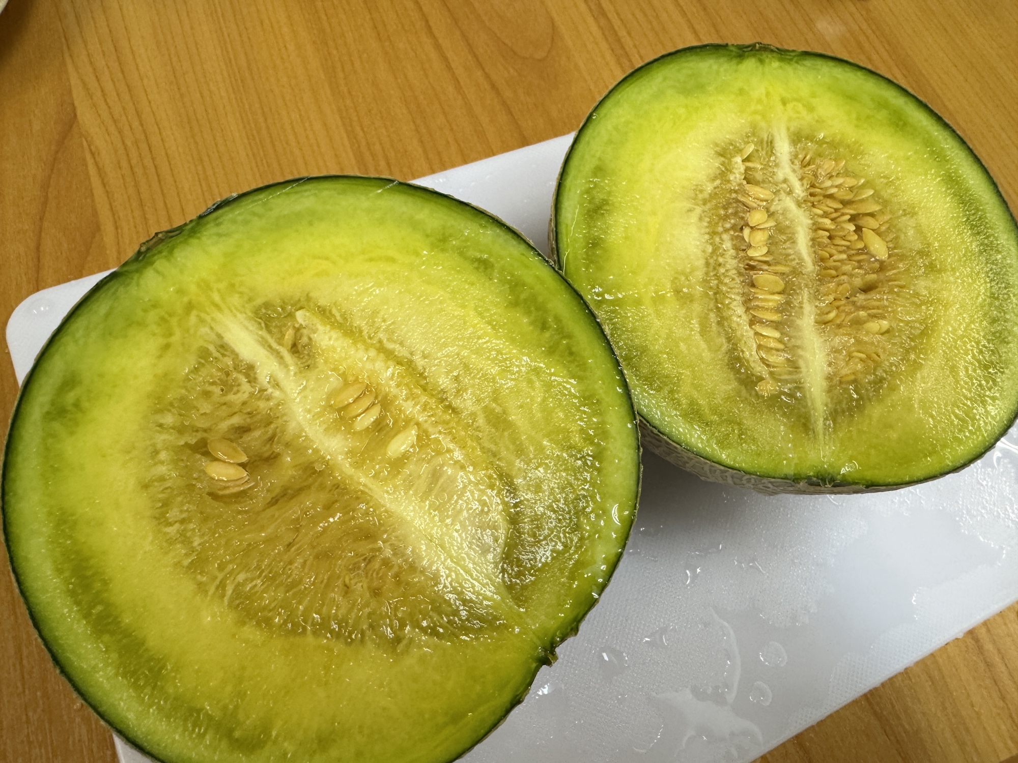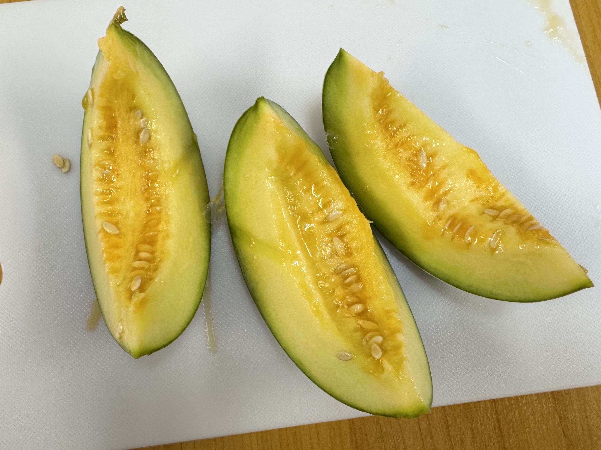 プリンスメロンの断面図。アンデスとは全然違うことが分かりますよね。包丁を入れれば「シャキッ」と野菜っぽい音がする。