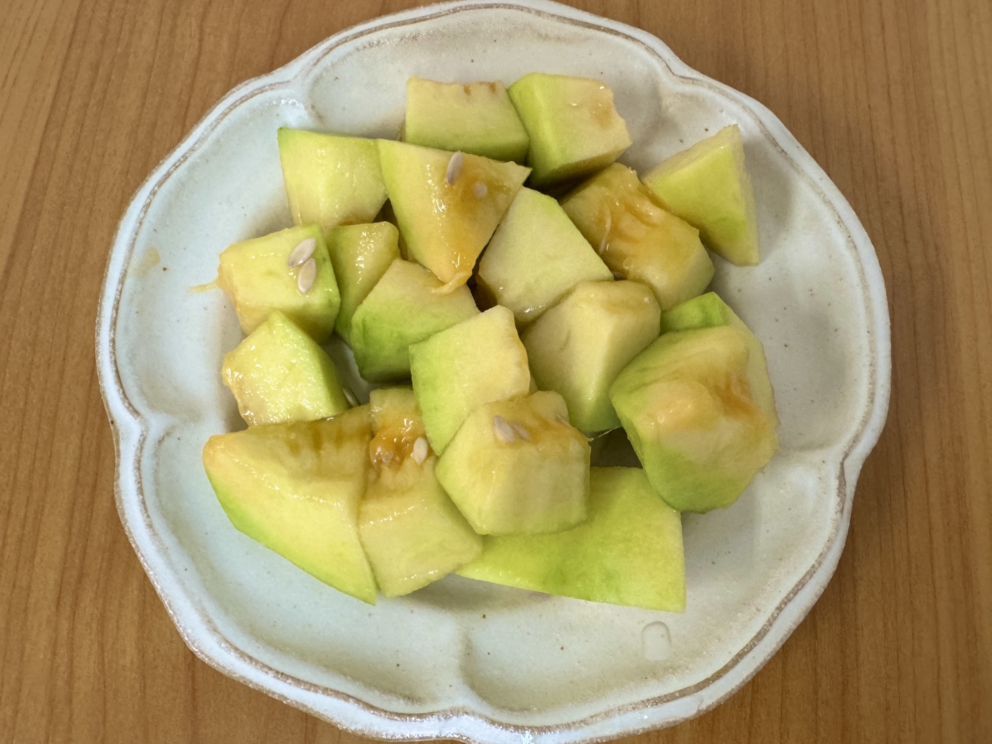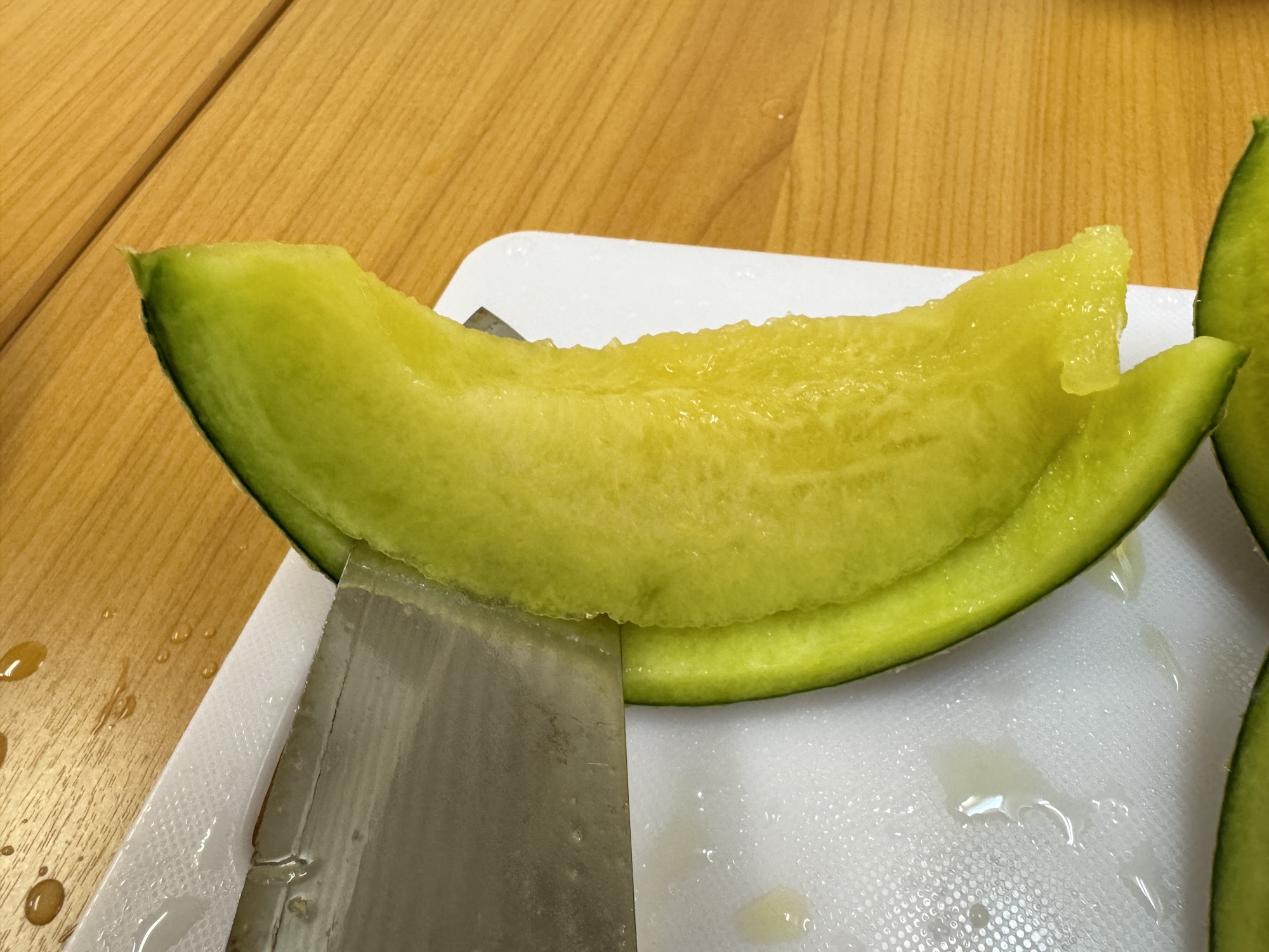 これは意図的に追熟させたとかは一切ない、正真正銘 “今日買ってきたメロン” 。網目メロンを滅多に食べないので、あまりの柔らかさ・蜜タップリなビジュアルに戦慄をおぼえずにいられない。