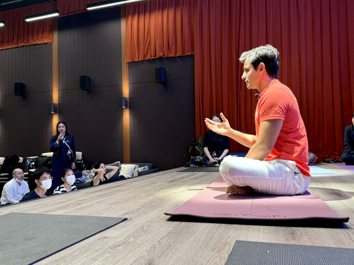 このヨガ体験はほぼ毎日17時から1時間コースで開催されており、人数はざっと30人くらいはいただろうか? インド人の先生と通訳の方が二人三脚でお届けする、本場バーラト(インド)のヨガレッスンで、参加費は無料だ。