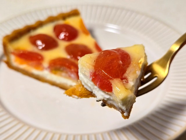 タルト生地にもトマトペーストが練り込まれているとのことで、普通のタルトより赤っぽい色をしているな。見た目もシンプルでかわいいし、トマト好きならばきっと気に入ることだろう。