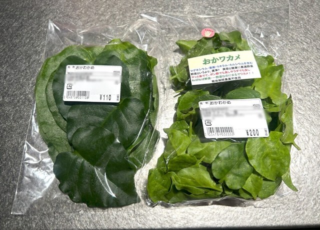 『おかワカメ』は今(6月)から秋にかけてがシーズンらしく、生産者が異なるものがズラリと並んでいた。いずれもモサっと入って、ひと袋100円から200円と良心的だ。