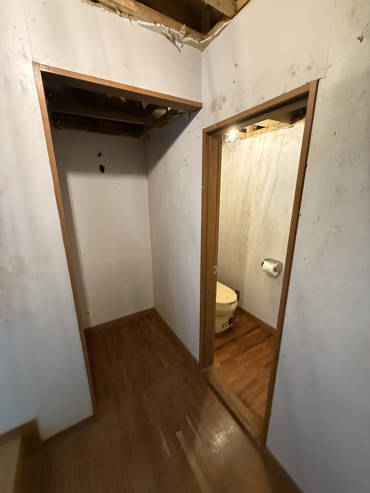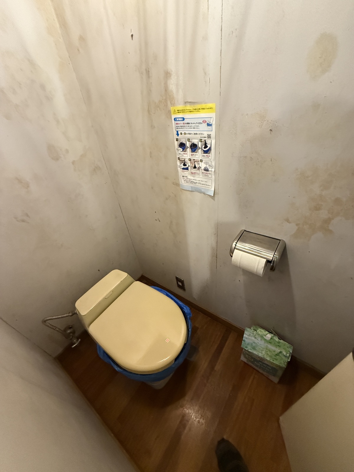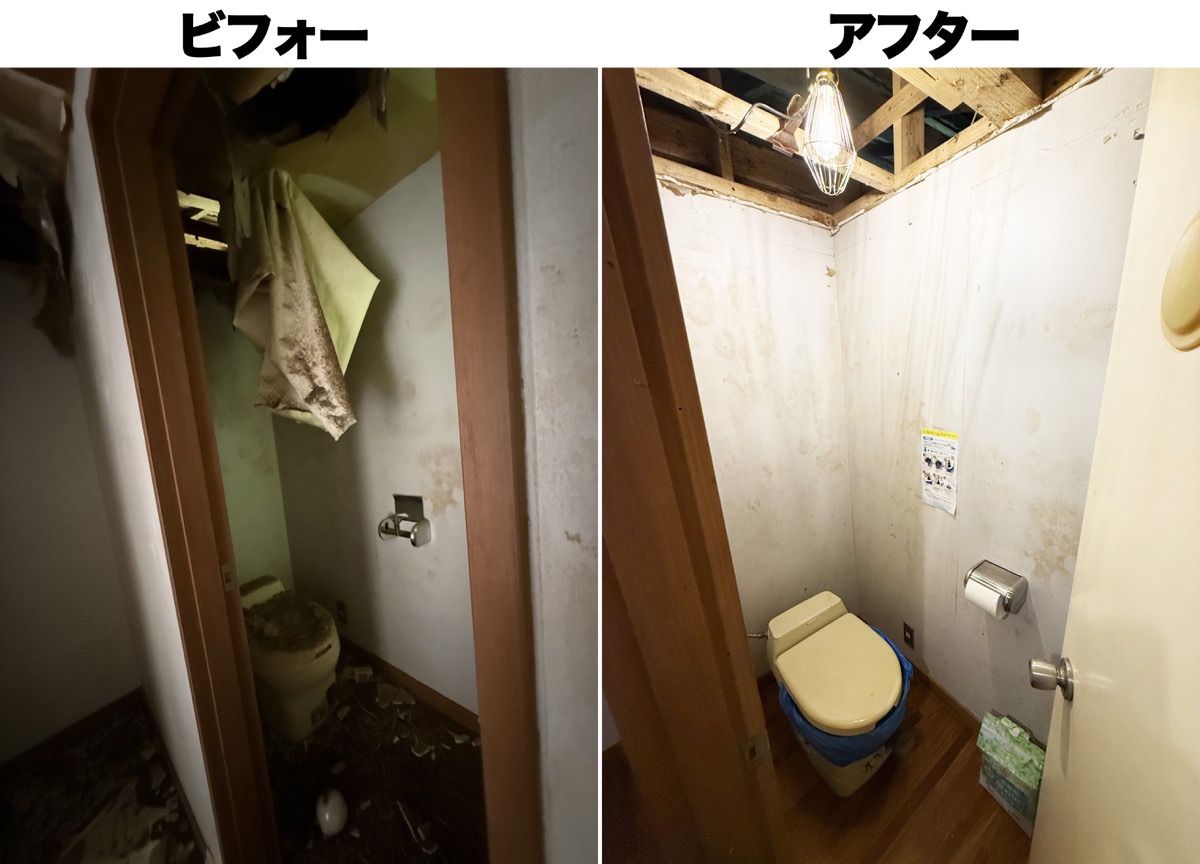 やったことは実にシンプル。トイレ含む、トイレ近辺の剥がれた天井をブチ抜いて、瓦礫やホコリやゴミも掃除しつつ、便器もピカピカに磨いて……という感じ。