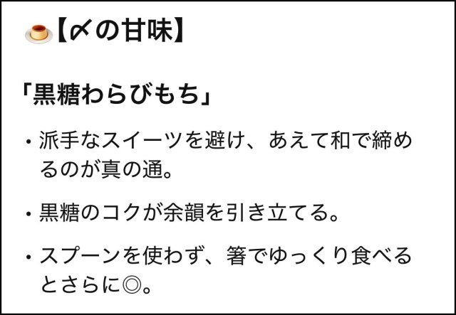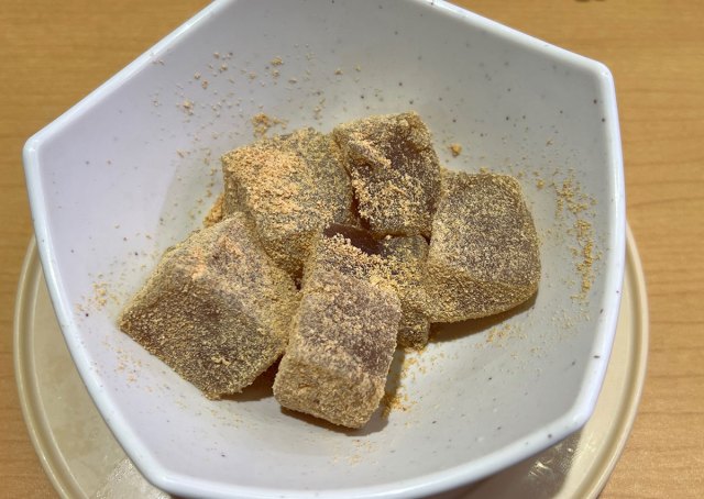 同じ商品がなかったので、似たような「わらびもち」を注文。ここで派手な洋菓子系のデザートを食べると、寿司の余韻が台無しになりかねない。その点、「わらびもち」ってのは絶妙なチョイスな気がする。さすが、有料版ChatGPTだ。