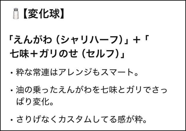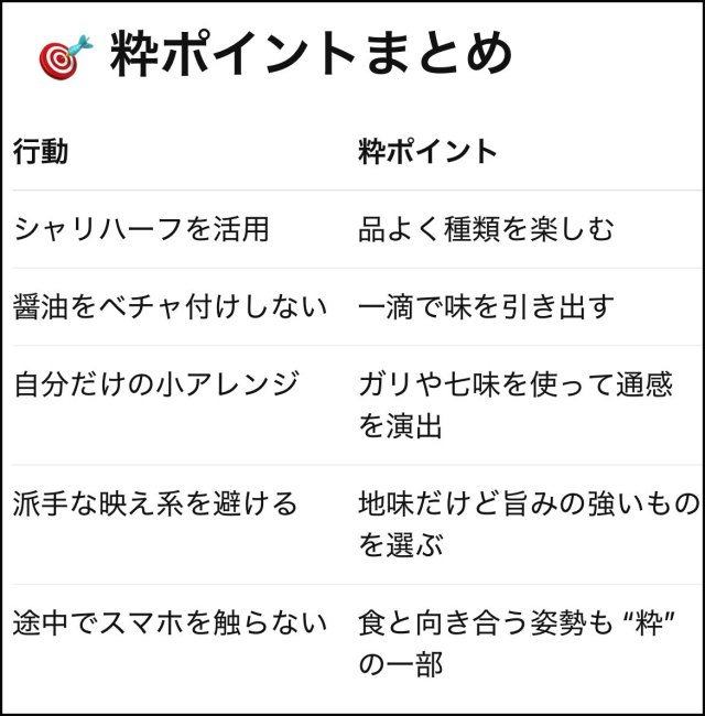 実際にやってみた感想をひとことで言うならば、「これでは腹一杯にならない」というところ。一方で、粋かと言われたら確かに粋な注文な気がした。