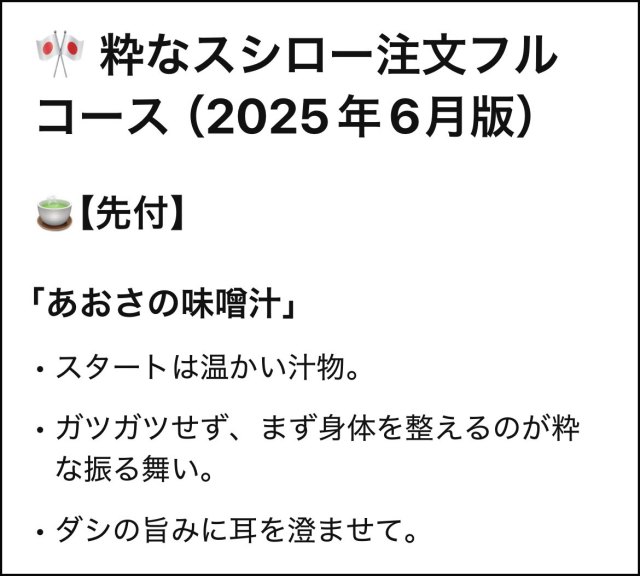 ▼これに「わらびもち」を加えたのが、私のAIが考えたスシローでの粋な注文フルコース。季節柄も考慮してチョイスしてくれたようなので、2025年6月時点としておこう